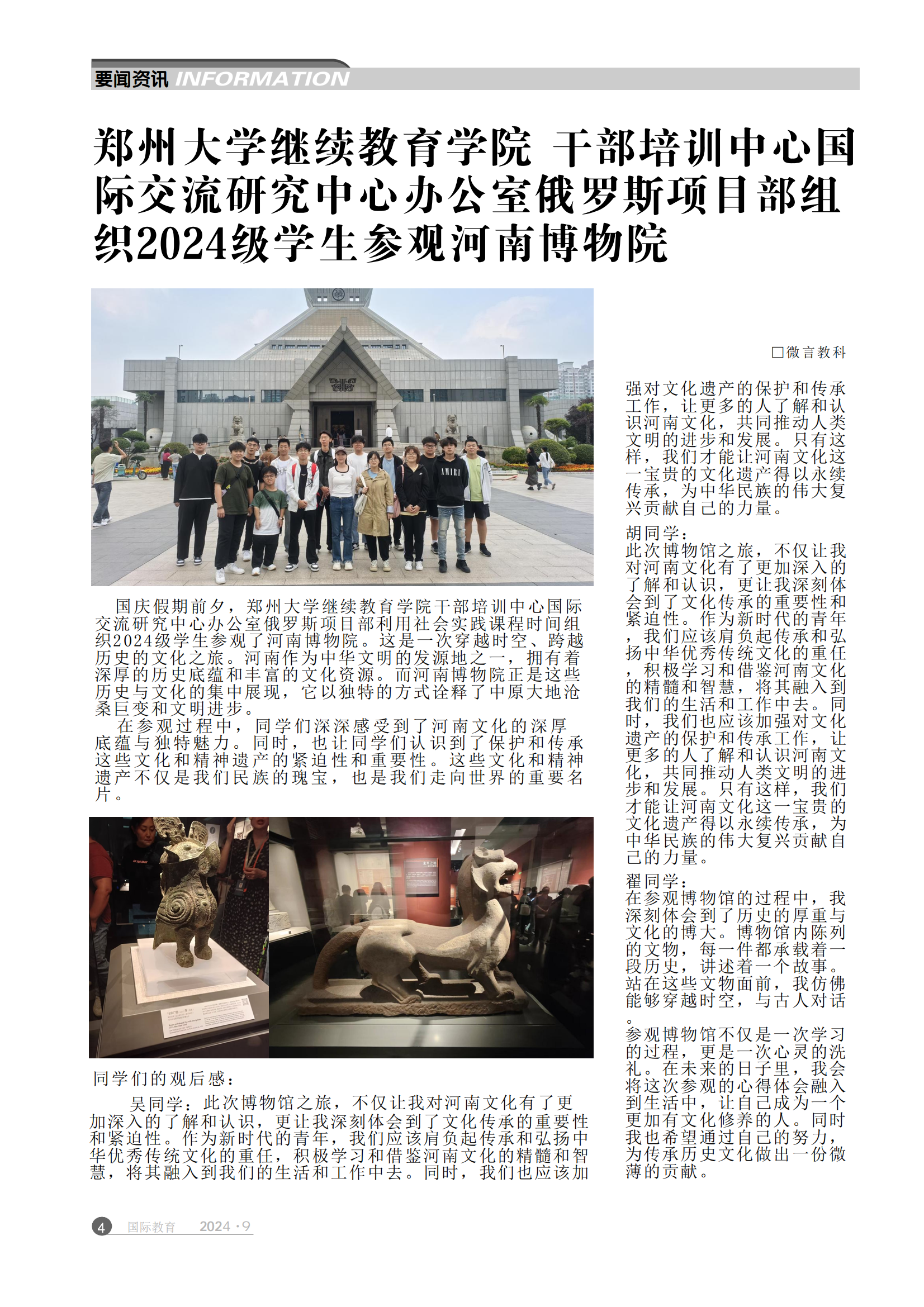 鄭州大(dà)學繼續教育學院 幹部培訓中心國(guó)際交流研究中心辦公室↑Ω俄羅斯項目部組織2024級學生(shēng)參觀河(hé)南α&(nán)博物(wù)院